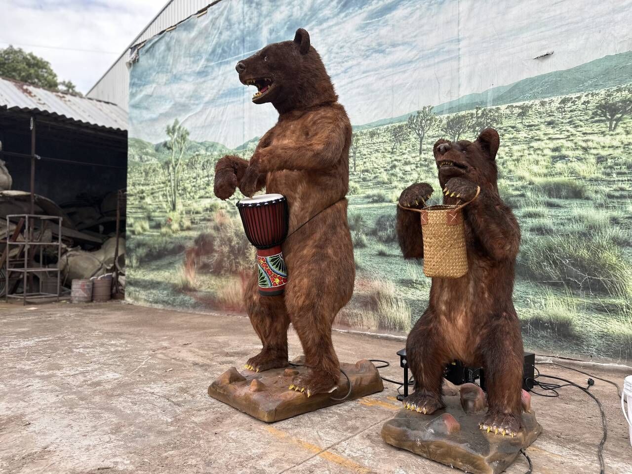 This animatronic bear holding a touberleki and his baby is holding a container to cadge.we are switching the human with the animal. At the old times, people were holdings a touberleki and having a trained bear to dance. We use artificial fur to replicate realistic bear model.This animatronic bear model is perfect for indoor exhibitions , ensuring a reliable and impressive display wherever you choose to showcase it. Beyond entertainment, our animatronic bear model serves as an educational tool